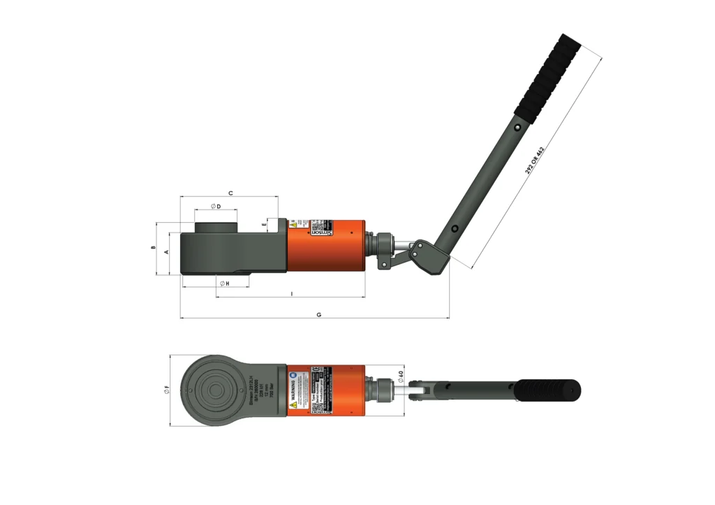 | Modell SIMSON | Slaglängd mm | Kapacitet* ton (Kn) | Artikel no | Area cm2 | Vikt kg | A mm | B mm | C mm | D Ø mm | E mm | F mm | G mm | H Ø mm | I mm |
